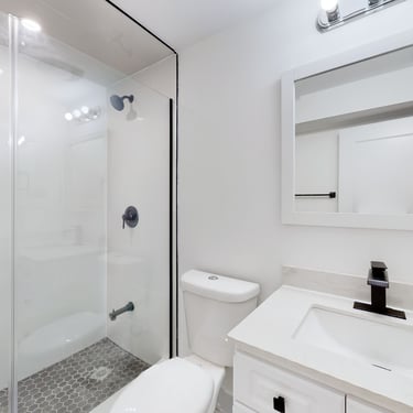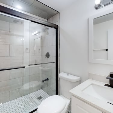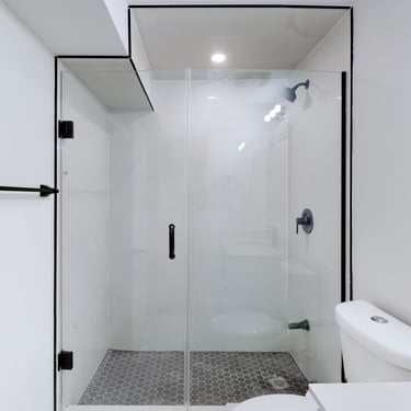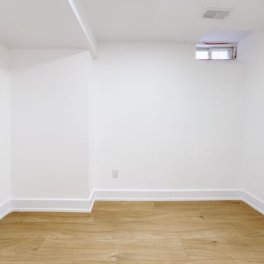 Washroom with standing shower, Vinyl flooring, laminated stair steps, egress window etc.