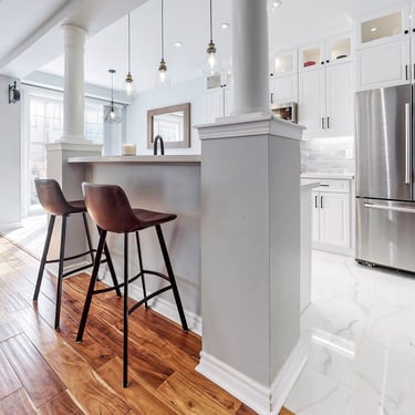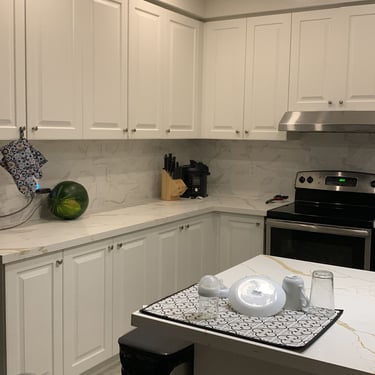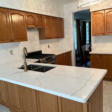 Replaced Laminate Countertop with Quartz, added New backsplash, pot lights and hanging lights over the island