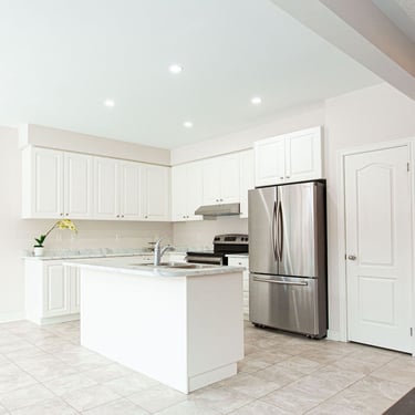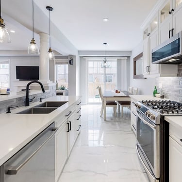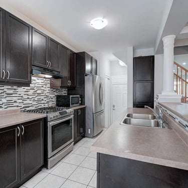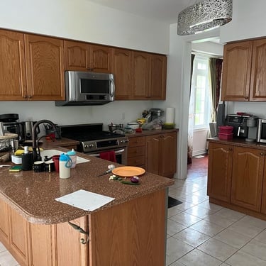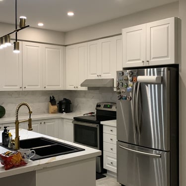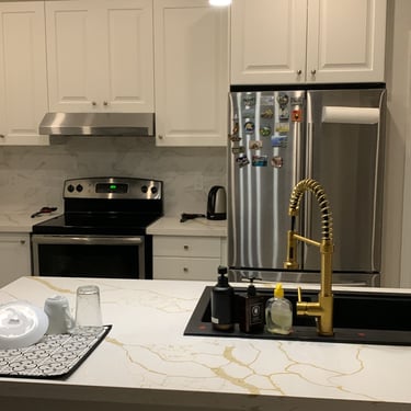 Removed the old kitchen cabinets and laminated countertop. Installed new Kitchen with Quartz and new tiles on the floor. Addition of pot lights, undercabinet lights, upper cabinet lights and pendant lights.